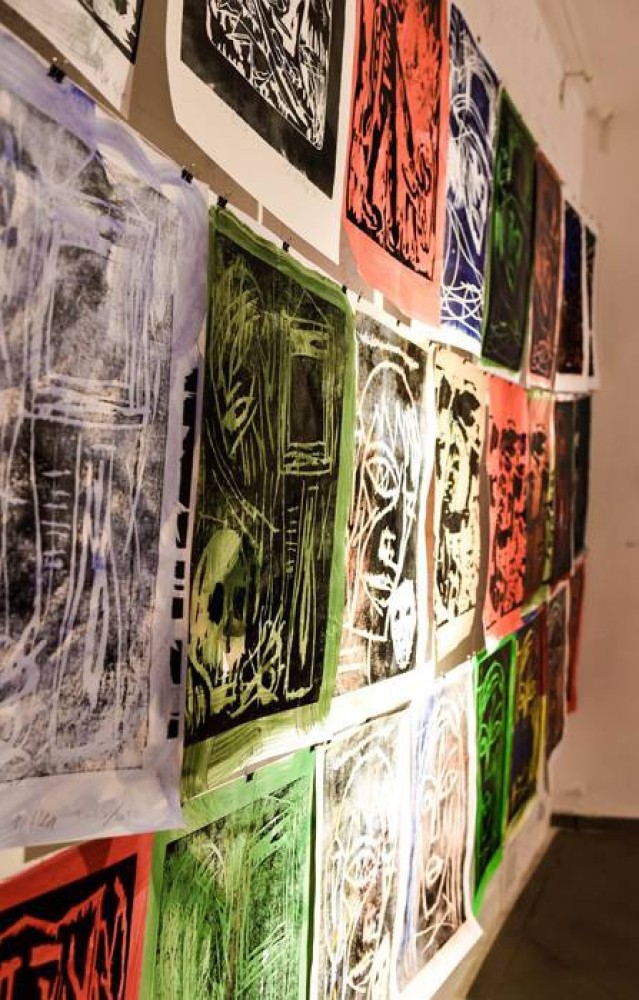 The aftermath of Nitka’s graphical work are large paintings made on wooden backgrounds with a carved drawing and covered – in a painterly fashion – with thick paint (David and Bathsheba, 2015). Like many of his expressionist predecessors, Nitka is also trying his strength in fully-realised woodcarving projects. The Golem (2015) presented in the exhibition refers to Gustav Meyernik’s text, but is also a simplified sculptural-painting totem in the spirit of the works of Karel Appel and Georg Baselitz – a neo-expressionist particularly valued by the Wrocław artist.